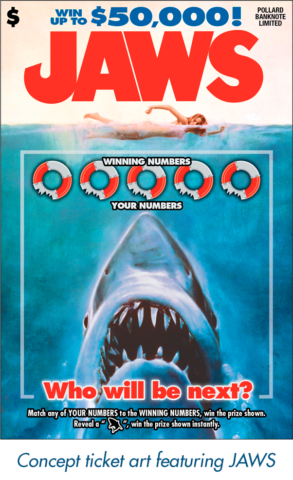 “JAWS immediately conjures up images of summer, sand, surf, and SHARK!” said Brad Thompson, Vice President, Sales & Marketing, Pollard Banknote. “We are excited to add this title to our collection of licensed properties. Instant tickets that feature Pollard Banknote’s attention-grabbing JAWS ticket art—inspired by the iconic movie poster—and entertaining game play will result in lottery players, both new and existing, scrambling out of the water and into line at retail.”