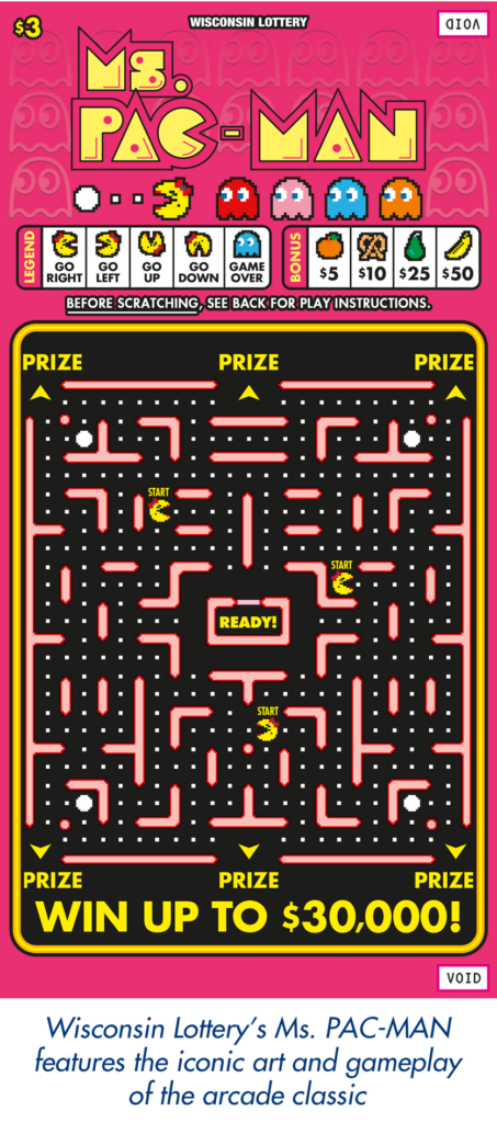 Designed and printed by Pollard Banknote in collaboration with the Wisconsin Lottery, the game was inspired by the colorful, instantly recognizable art and gameplay of the classic arcade game. Each ticket offers players the chance to follow Ms.PAC-MAN as she navigates three paths through the maze. If her path leads to one of the six prize areas, players win the indicated prize amount, and receive an additional prize if the revealed path runs into one of the bonus symbols.