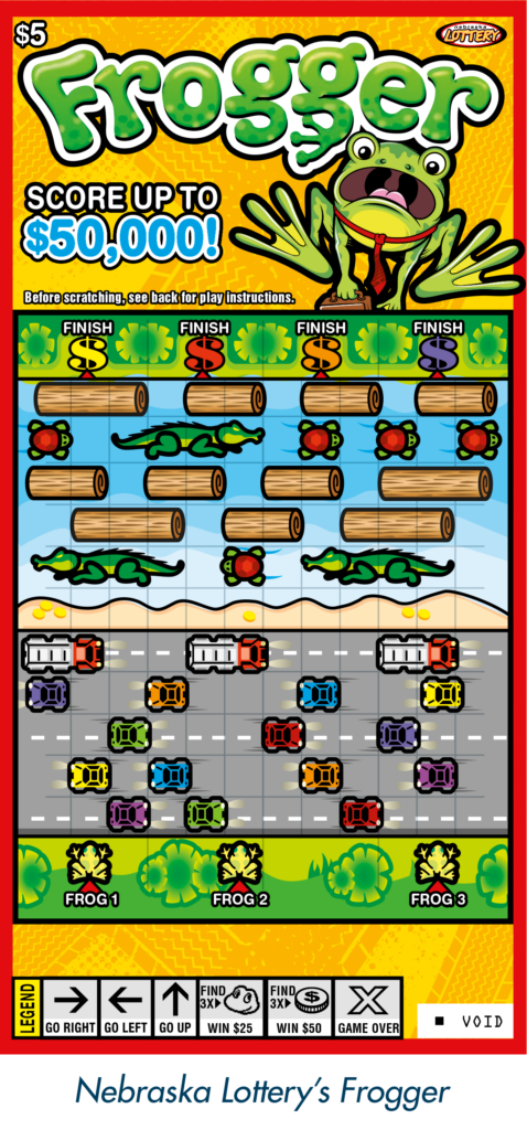 The Nebraska Lottery’s newest Frogger ticket features vibrant yellow and green artwork to really jump out to players at retail, incorporates the popular maze-style gameplay, and offers players a chance to win up to $50,000 instantly!